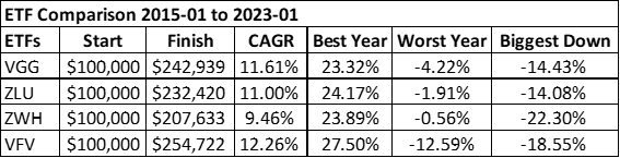 As is often the case, the low-cost market index fund wins out for total return. Over a long lifetime of investing, that 1.26% difference between the annual returns from ZLU & VFV, for example, could be huge. If you can tolerate the volatility, Mr. Buffett’s advice is looking good, the low-cost market index fund is the winner. But for more fearful investors, the lower volatility choices might help keep them in the market during times of steep decline. Jumping in & out of the market in response to market fluctuations can be a wealth killer for investors. For that reason, my choices would be VGG & ZLU in this instance. They don’t come as close to market returns as the two American ETFs we looked at earlier. But they’re good enough for me & I think I’d manage a better night’s sleep with those in my portfolio. I must be honest here, I was taken aback by how well ZLU has performed over the past 8 years. Can it sustain this level of performance? I have absolutely no idea. But I am impressed. ZWH was also surprisingly good. Though it shows the best “Worst Year” performance of the four, it had the biggest drawdown of the group, at 22.3%. That would have been a heart-stopper for me. Yet it managed to recover from that big drawdown to post pretty decent results over time. That’s a good outcome. Its total return over the period, however, lags the other two, so I would probably choose those instead. In retirement, when an income stream might be more important, ZWH might earn a place in a portfolio for some.
