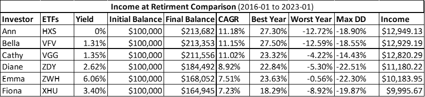 Look at the Income column, the last one on the right. This is the income stream that would result from all the ETFs being sold off on retirement day to buy ZWH, the highest yielding ETF. The biggest income stream can be had by selling the portfolio that gave the best total return. And then buying the ETF with the greatest distribution, in this case ZWH. There is a 30% spread here, that’s significant.